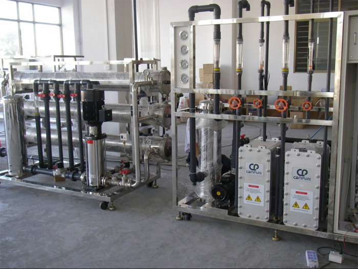 电去离子(Electrodeionization,以下简称EDI),是结合了两种成熟的水纯化技术——电渗析和离子交换的一种新的水处理技术。当水通过EDI膜堆时,水中的阴阳离子被离子交换树脂吸附和传导,同时,这些阴阳离子在直流电场的作用下,分别透过阴阳离子交换膜进入浓缩水室而被除去。这一过程中离子交换树脂是被水电解产生的H+、OH-连续再生的,水中溶解的盐分可在低能耗及不须化学再生的条件下除去,这样高电阻率的产品纯水就可以大流速,持续不断地生产。